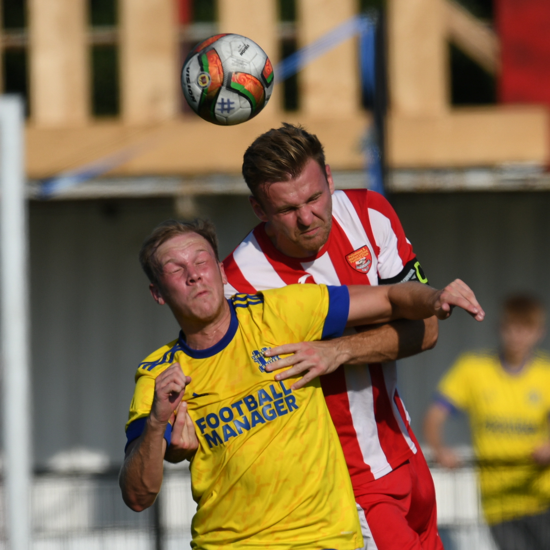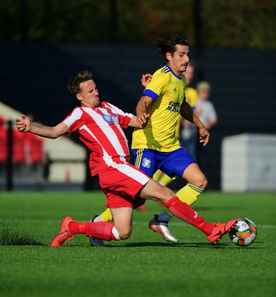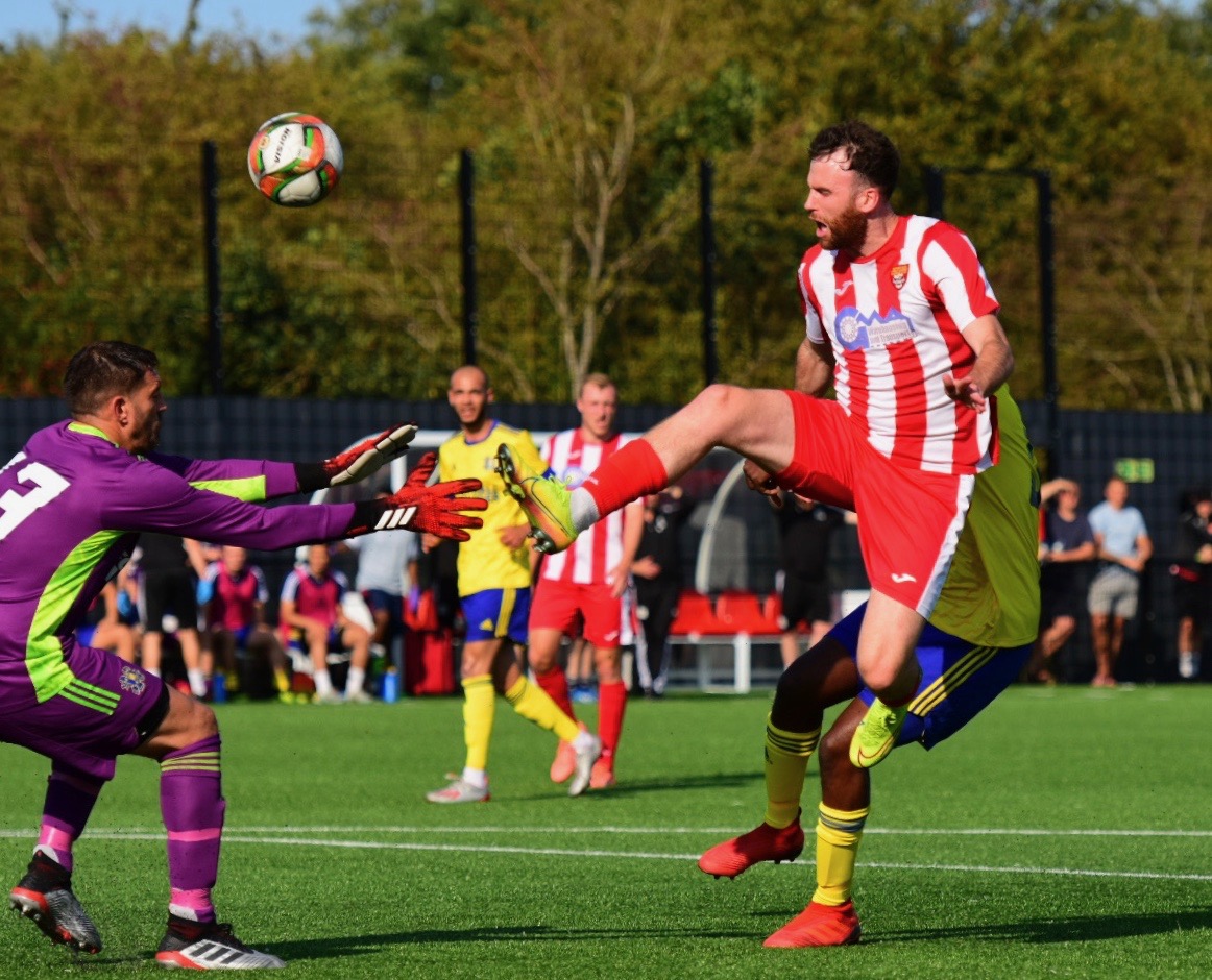 Felixstowe were straight on the front foot at the start of the first half, Armani Schaar causing problems for the home defence and substitute Kyle Jopling launching a fierce shot that flew just wide with the Goalkeeper clutching thin air as he dived to cover the post. The home side were unfortunate not to extend their lead as the half wore on, twice being denied by excellent saves from Callum Robinson, one from close range as he someone managed to claw the goal-bound strike away from danger. Felixstowe finally found an equaliser on 74 minutes, Henry Barley amongst three Seasiders on the edge of the box, and he rifled a great shot beyond the keeper to level the tie. Neither side had any further clear cut chances as the game edged towards the final whistle, delayed severely by a blood injury to captain Josh Kerridge.