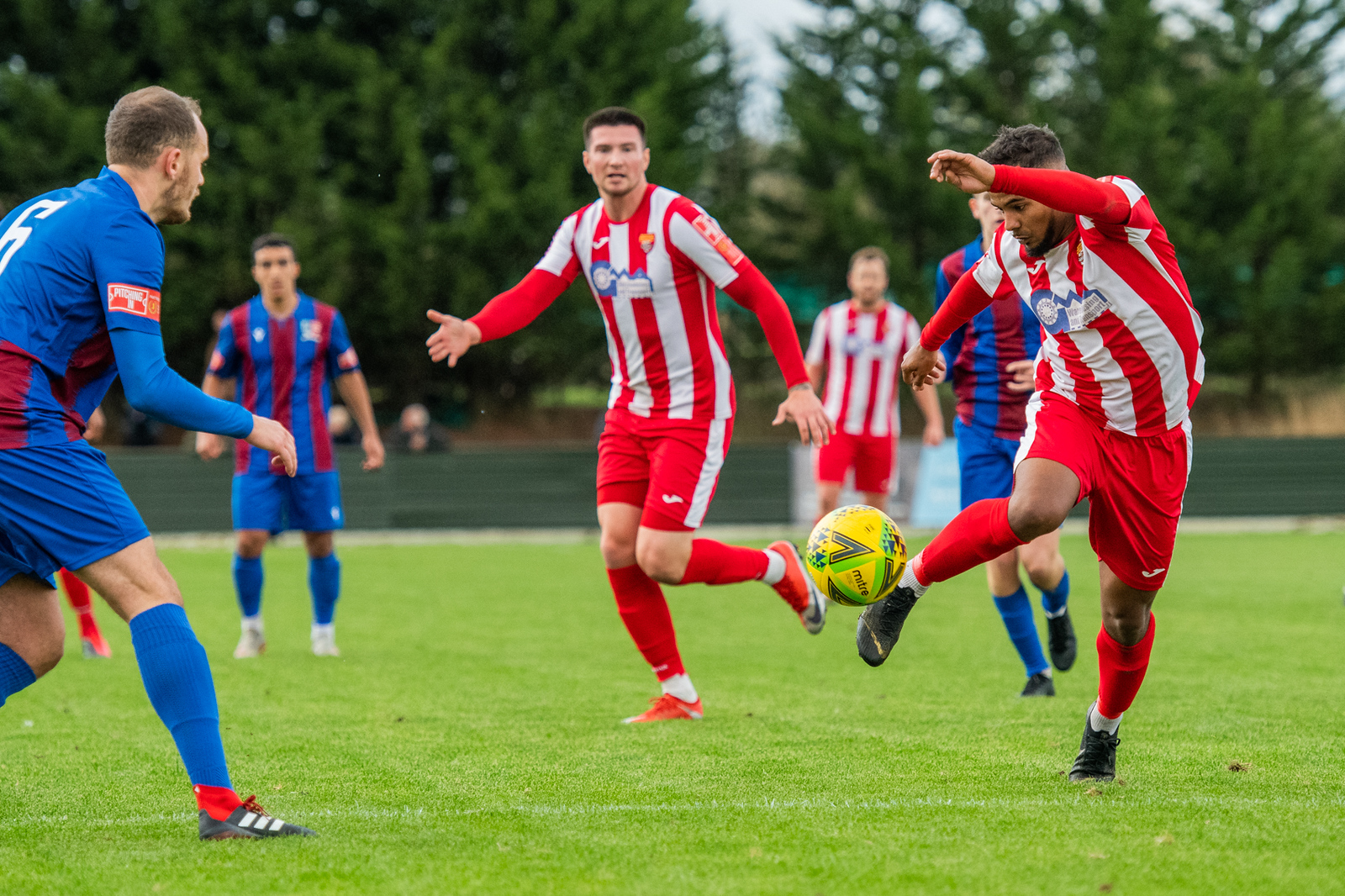 Felixstowe did start to create chances in the second half, the best of which came on 52 minutes, Henry Barley with some great play on the wing and crossing for Armani Schaar whose stooping header agonisingly hit the foot of the far post and Lamell Howell following up from close range could only fire the ball over the bar amidst desperate defending from Maldon. The Jammers hit the post from what looked to be a cross shortly after and then effectively made the game safe on 64 minutes when Adam Vyse was on hand at the far post to deflect in a scrappy goal after Robinson had struggled with a swirling cross into the box. There was a hint of an own goal but Vyse was awarded his second goal of the afternoon. He didn’t have to wait long to complete his hat trick, converting from the penalty spot after a trip in the area. Robinson again cleverly tipped a long range strike over the bar as Maldon threatened to move further ahead. Ollie Canfer and Lamell Howell had similar chances as the game petered out, both forcing their way into the box but shooting straight at the goalkeeper on each occasion.