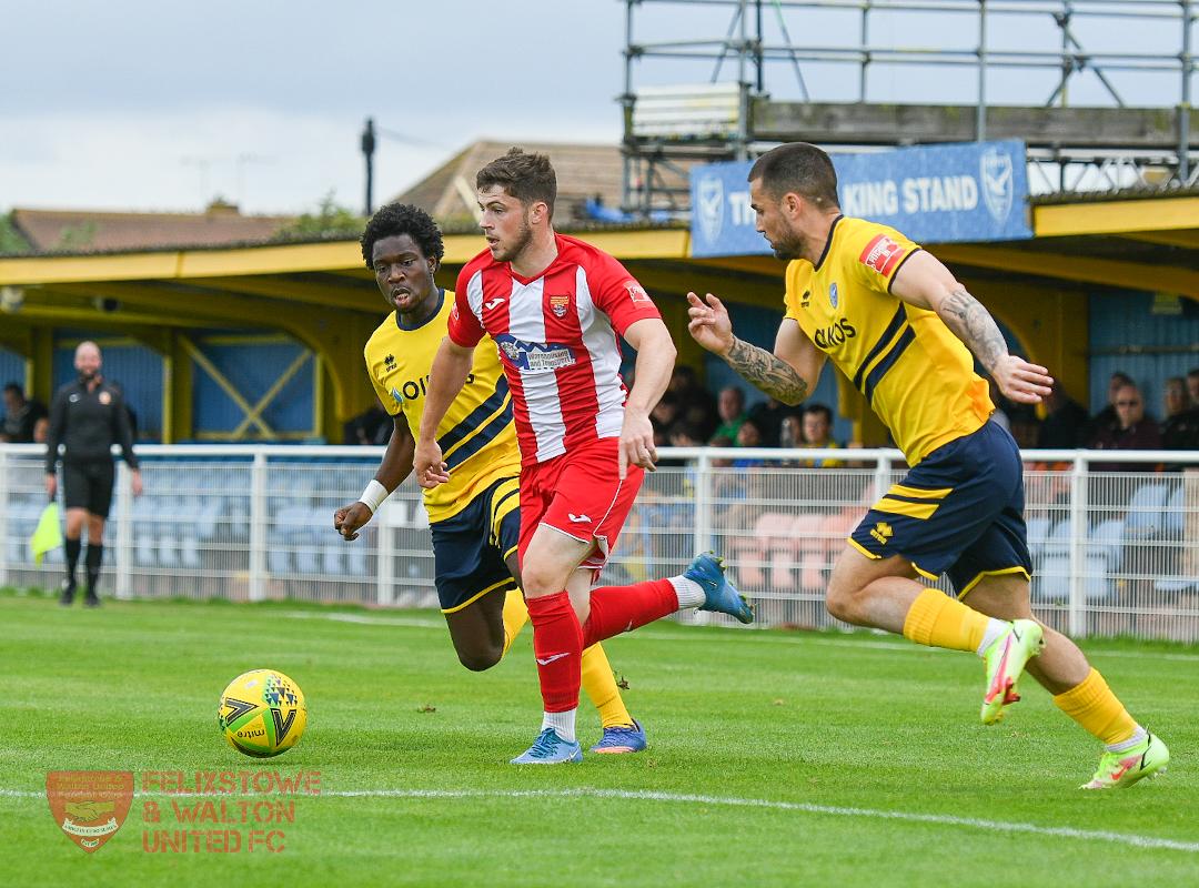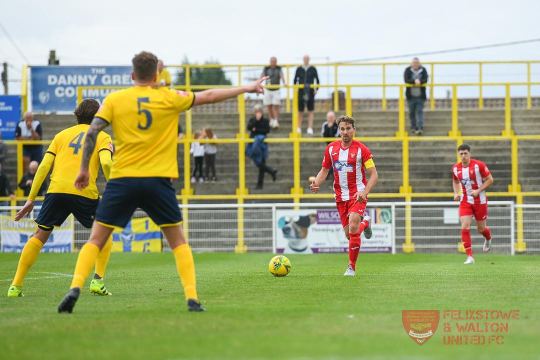 The second half saw a tactical switch by the home side to stifle the Seasiders and frustrate at every opportunity, chances therefore were hard to come by in the period and when Canvey took the lead on 51 minutes it was an uphill battle from there. It was some decent build up and a dangerous cross into the box that made it a simple task for Elliott Ronto to flick across the goal and over the line. Sam Nunn was forced off on the hour mark and on his way to hospital with a deep leg wound after crashing into a sharp, protruding section of pitch barrier and getting his knee impaled under the barrier, his leg was freed after some careful work from both physios, players and even some supporters from Felixstowe. Canvey thought they had doubled their lead when play resumed when a similar ball into the box that had led to the goal was turned in by Price, but this time the offside flag was already up. The last half hour was a very scrappy affair and apart from a penalty shout for the Gulls on 85 minutes, nothing of any note was created by either side. Joe Whight did have an opportunity with a free kick from outside the box which was the last kick of the game but his effort went over the bar.