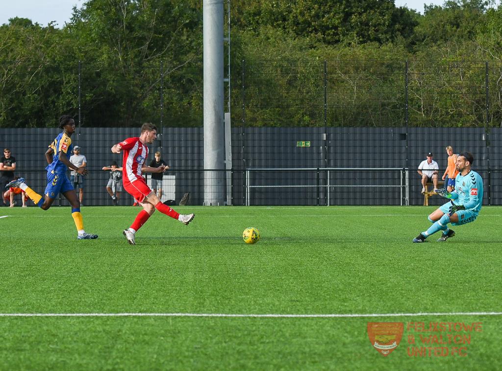 Felixstowe Manager Stuart Boardley spoke to the Media team after the game. “I asked the lads for a solid, professional performance today, get three points and to keep a clean sheet, and we did all that! I couldn’t ask any more of them on a very hot day, and the heat did affect both sides as the game was not that quick a pace. We created more than enough chances to win the game today, we went through a spell in the second half where we stopped passing the football and stopped trying to play up from the back, and we went a bit long really and played into their hands a bit, but when we had our good spells in the game, when we created all our chances, got the ball down and were brave, we passed it right through them. We had stopped that for that period but as soon as we got our heads together and figured that out and started passing the ball again, that’s when I think we looked the more dangerous side once again”. Boards went on to say. “Zak missed a few opportunities but he’s getting in the right areas, got two goals today but will be disappointed he didn’t get a hat trick, but he did his job and got us the goals that won us the game. I thought from one to eleven we did well today, Lamell Howell came on and did well out of his usual position in that right wingback role so that was great, but it was an all-round solid team performance today. We have mixed emotions about the break we now have, the ten day break has come at the wrong time in some ways as we are on a bit of a roll, but equally the break will allow some of the boys who weren’t here today the chance to get back and get a full solid week of training ahead of the difficult home game against Heybridge Swifts on Tuesday week (28th Sept)”.
