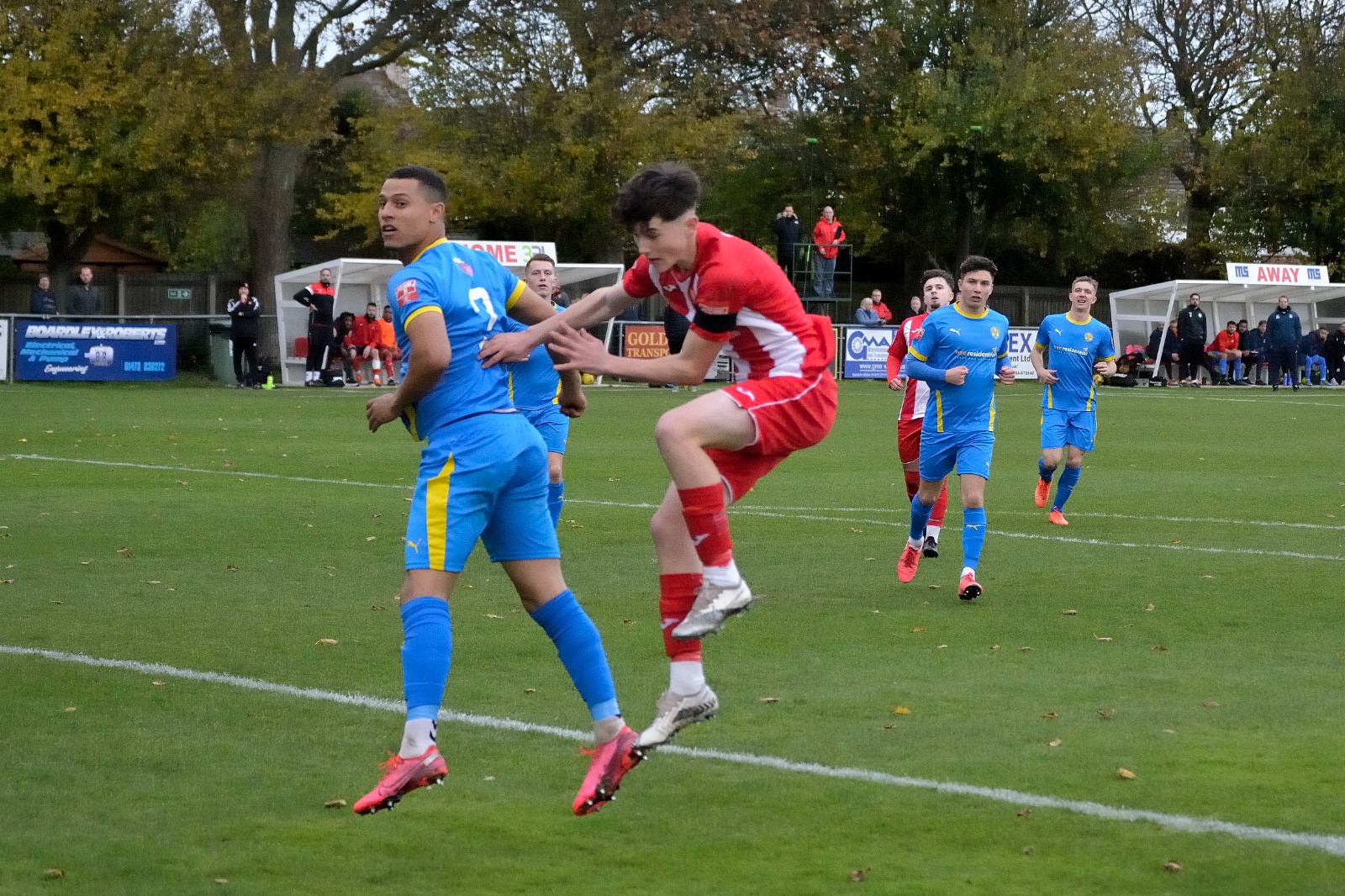 Peterborough were well supported and their fans were soon celebrating the opening goal, Ryan Fryatt rising highest to nod in a free kick on five minutes after a defensive mix-up for Felixstowe. The atmosphere was understandably muted by the early goal and the knowledge that Step 3 leaders Peterborough had scored 41 goals in 13 league matches this season clearly led to thoughts of a long afternoon ahead. The Turbines were seeing more of the ball but Felixstowe were starting to find their feet in the game and were matching their opponents in all areas of the pitch. Zak Brown did well on 8 minutes to create space and cross to the far post, unfortunately a defender cleared for a corner before Ollie Canfer could connect. Sam Nunn saw his goal bound header saved by the goalkeeper from the corner as Felixstowe continued to press for an equaliser. It only took until the 17th minute for that equaliser to appear and it was that man Henry Barley again weaving his magic to score a stunning goal, winning the ball on the right, cutting inside and sending a rocket of a shot, as straight as an arrow into the top left corner. The goal settled Felixstowe further as the confidence grew on and off the field. Peterborough were quick going forward with their three-pronged attack but were not troubling Danny Crump too much in the home goal. Lewis Hilliard spun in the box to shoot on 21 minutes but Armani Schaar was there to clear the danger. Felixstowe had a golden chance to take the lead on 24 minutes, Charlie Warren doing brilliantly on the left to cut in and fire towards goal, the keeper could only block on the line and clear to Zak Brown whose shot was cleared off the line by two defenders. The away side upped the pressure as the first half drew to a close but could only create half chances, Sam Nunn heading out for a corner from a dangerous cross and Fryatt heading wide when positioned well at the far post as the whistle blew for half time.