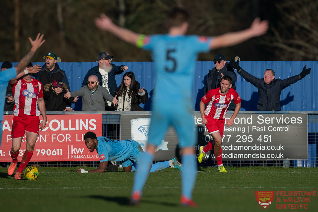 Neither side started well with plenty of poor clearances and attempted moves breaking down. Manny Osei created the first chance on 3 minutes with a break on the left, he fed Hasanally who found Jordy Matthews on the edge of the box but he sliced his shot wide of the goal. Brentwood’s first chance of the quiet opening came on 10 minutes, the always lively Rob Harvey crossing into a dangerous area, the defensive clearance only landed as far as George Craddock but his wayward shot only troubled visitors to the Antiques fair happening in the adjacent Leisure Centre (No expensive Vases were hurt). The game remained a poor spectacle with neither side able to string too many passes together and create anything of note. That all changed in the space of two minutes with action at both ends, that in the end proved decisive. On 25 minutes it was Felixstowe who scored the crucial first goal, Andre Hasanally turning and firing home from 16 yards from a central position, the goalkeeper could possibly have done better with the shot but it was still a fine finish from the Colchester youngster. The celebrations were still ongoing amongst the away support when the referee pointed to the spot the other end, a soft nudge into a forward making a simple decision for the official. I’ll be honest and say the glare from the winter sun made it impossible for me to see who stepped up to take the penalty! But the sun didn’t block by view of the penalty save, Robinson guessing correctly to dive to his left to smother the low but weak attempt. On 28 minutes Osei broke again down the left to set up a cross for Stuart Ainsley, his pinpoint cross was met by the head of Henry Barley whose effort flew just over the bar. Harvey for the home side again found himself in a great position on 30 minutes but blazed his shot high and wide. A free kick on 42 minutes was crossed well into the box but the ball was cleared by Joe Whight and Robinson as several home shirts played head tennis in the six yard box but the ball would just not fall kindly for them. Ollie Canfer then had a golden chance to double the advantage, juggling the ball on the edge of the area and teeing himself up for a beautiful volley that flew inches wide of the left post with the keeper stranded. Osei then created a chance for himself but volleyed over from distance before Brentwood had a great chance to level as the clock ticked onto 45 minutes, Harvey again causing trouble down the right and crossing for Craddock whose shot from an angle was met with a great reactionary save from Robinson to tip it over the bar.