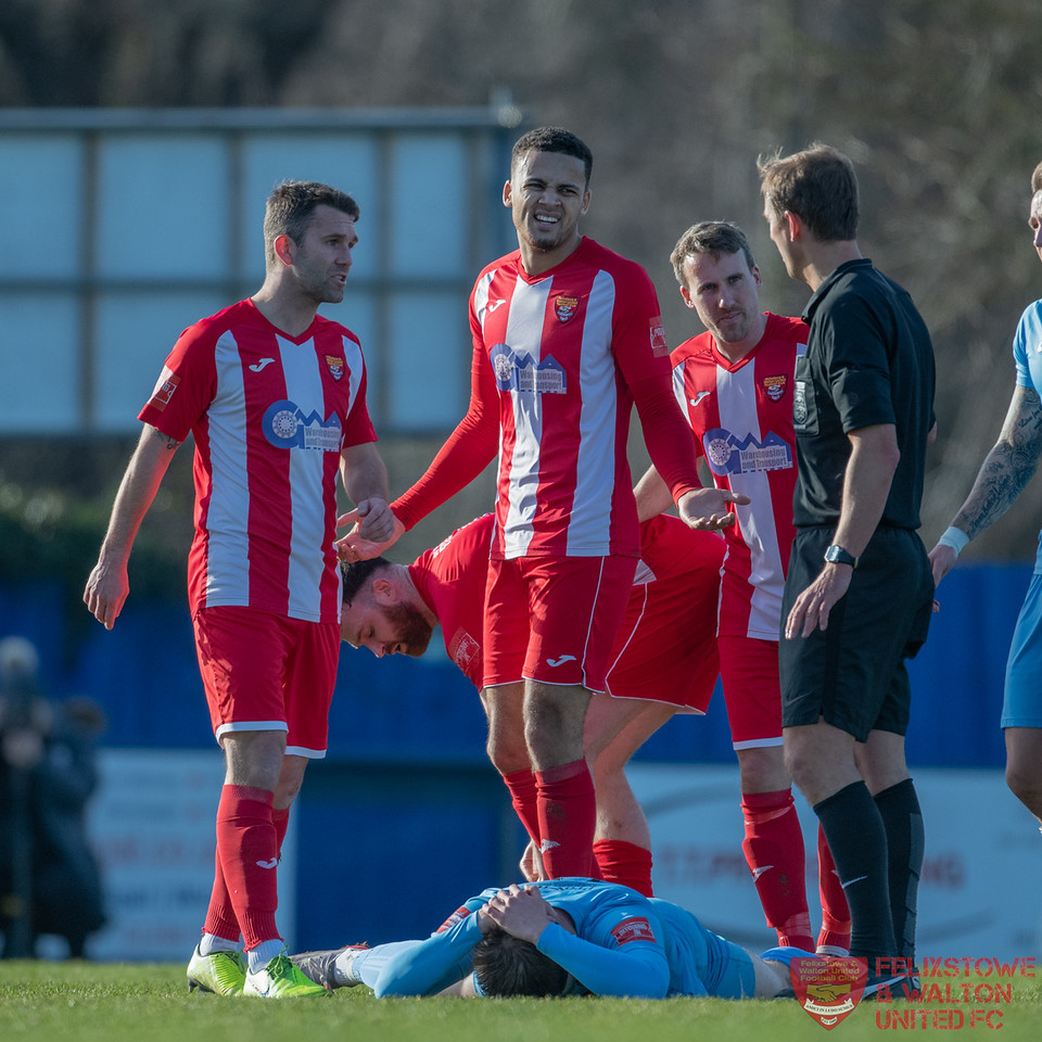 Felixstowe were missing Billy Holland who was starting the first of a two game suspension for bookings received, but there was finally some good news for the squad with Noel Aitkens and Henry Barley returning to the starting line-up, Manny Osei finally getting to make his long awaited debut following his loan signing from Stowmarket a fortnight ago, and the great sight on the bench of both Leon Ottley-Gooch and Josh Hitter, both fighting back from long term injuries. The home side were dealt a major blow in the warm up, 19 goal marksmen Tom Richardson pulled up and had to be replaced.