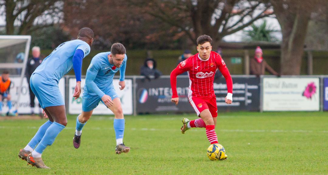 Brentwood missed their second best chance of the match on 49 minutes, a scramble in the box led to numerous stabs at trying to get the ball over the line, but the home defence held firm and Callum Robinson mopped up to grab the ball from the thick of the group of players and save on his line. George Clarke found himself through on goal on 53 minutes, in a position that he loves to score from, he cleverly beat his marker to latch onto the through ball and as he reached the edge of the area and let fly with his right foot, the ball seemed to take a slight bobble, sending his effort wide of the target. Brentwood again missed a golden opportunity two minutes later, a free kick on the edge of the area was palmed away by Robinson and into the path of the away front man, strangely he decided to take a touch instead of smashing the ball home, allowing him to be closed down and his shot deflected wide for a corner, the wide effort from that resultant set piece being Brentwood’s last real chance of the game. Felixstowe were fully aware that a second goal was required, memories of that hot August opening day afternoon in Essex at the reverse fixture still vivid for a Seasiders team that had seen a 96th minute equaliser grab an undeserved point for the home side on that occasion. Josh Hitter decided he was the man to come on and nab that crucial second, the popular midfielder coming on for Canfer and immediately making his mark on the match with his ever-running engine and neat touches, after just 8 minutes on the field he burst through a crowd of players and was brought down on the edge of the area, strong appeals for a penalty were waved away by the excellent referee and the ball placed directly on the 18 yard line, Hitter expertly diverted the ball under the wall and under the goalkeeper to nestle in the bottom right corner to score that vital second. Felixstowe comfortably saw out the remainder of the match and were unlucky not to score a third with their best move of the match on 69 minutes, Callum Bennett did well on the right to set up Henry Barley on the wing, he evaded the close defender to pass to Noel Aitkens in the area who laid it off to Josh Hitter who turned and passed the ball past two further defenders to Andre Hasanally who shot from 9 yards, his effort was cleared inches from the line by some desperate defending to save a certain goal. The three points moved Felixstowe into fifth place, Stowmarket seeing their match postponed on a day that saw the rest of the top six also win. Another highlight of the afternoon was the return of two key players to the side after lengthy injury layoffs, Henry Barley making his first start since 1st October and playing 73 minutes before being replaced by Callum Harrison who saw his first action since late October.