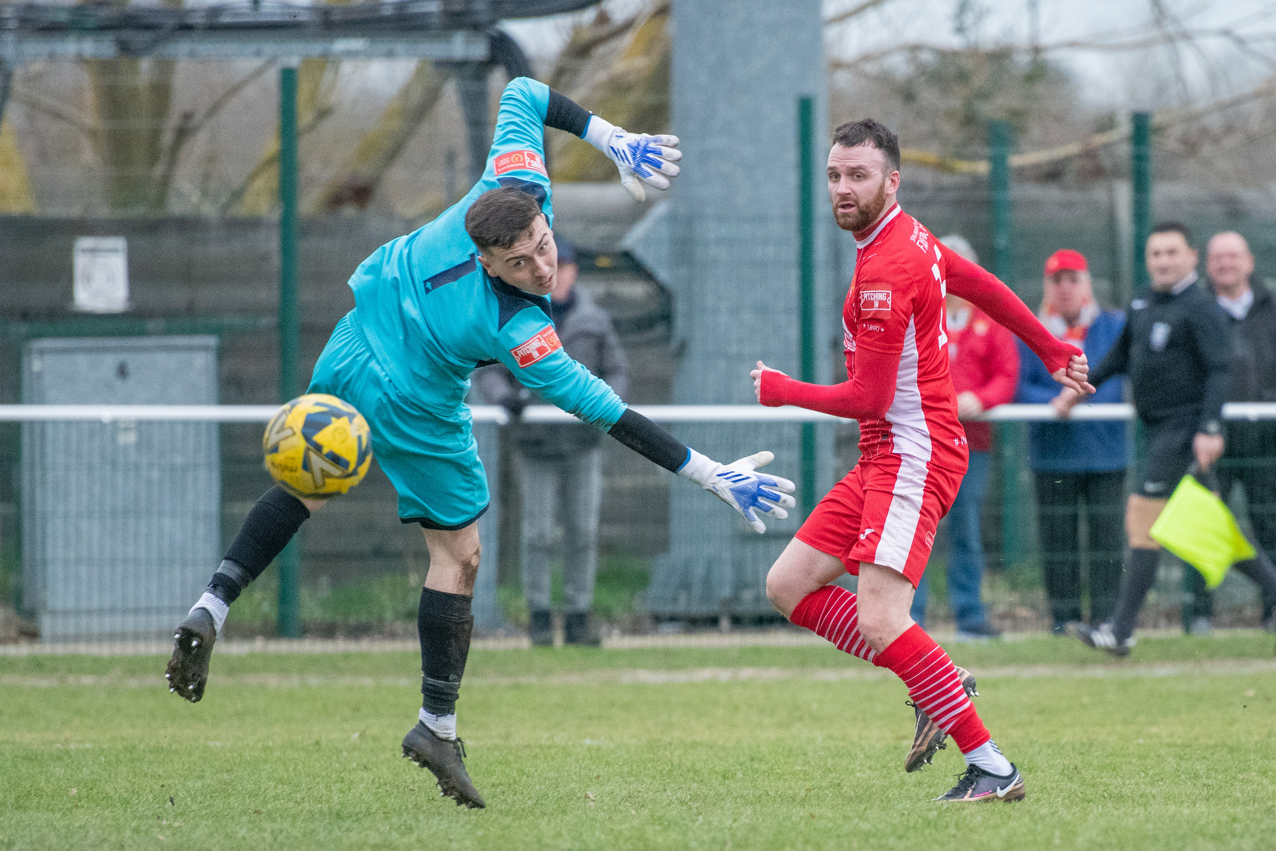Similar to that at Tilbury a fortnight ago, the pitch was not in a condition that suited Felixstowe’s style of play but they adapted well after a quiet start that had seen the home side have more of the ball and looking energetic rather than particularly capable of piercing the Seasiders rear-guard, despite playing four men up front for the first half an hour. The first chance for Felixstowe fell to Billy Holland on 12 minutes, his firm header from a corner going wide of the back post from a great position. George Clarke was bulldozing his way forward at every opportunity and he was set clear by Josh Hitter on 20 minutes, he rounded the goalkeeper inside the box but a combination of the keeper and his two defenders allowed the ball to be cleared to safety. Rovers seemed incapable of playing the offside trap throughout the game and time and time again, Felixstowe breached the defensive line with through balls which Clarke and Charlie Warren were lapping up. George Clarke knocked the ball down for Leon Ottley-Gooch to send in a piledriver from 25 yards on 25 minutes but the goalkeeper did well to keep it out. Two minutes later and Ottley-Gooch was not to be denied, and he scored his second goal of the week, following his effort at East Thurrock on Tuesday. Clarke had seen his effort cleared off the line and out, but quick feet from Warren and Barley saw a cross come back into the six-yard box for Ottley-Gooch to evade his marker and slam the ball home from close range. George Clarke was taken off straight away and replaced by Zak Brown after going down under a challenge in the lead up to the goal, and Brown was immediately carrying on Clarkes job of making it a difficult afternoon for the home defence, his first task was to win the ball in his own half and sprint through the opposition half, beat two defenders and spread the ball to Josh Hitter, he returned the favour to Brown in the box but the goalkeeper scrambled the effort away. The need for the second goal was evident on 38 minutes when the home side nearly equalised, the lively Harry Brown at number nine produced a fierce shot from 16 yards that Callum Robinson did brilliantly to keep out at ground level, with the ball spinning away towards the goal before being cleared. That crucial goal did come for the Seasiders as the clock ticked over into added time at the end of the first half, again Zak Brown was unplayable up top and his burst forward resulted in a high cross to the far edge of the six-yard box which Josh Hitter was steaming towards, and he converted brilliantly from a tight angle to get the goal his first half display had deserved. Joe Whight, a pillar of strength at the back, showed his abilities higher up the field too before the whistle, his free kick from 20 yards out on the right looking like extending the lead before the goalkeeper pulled off a fine save at the near post.