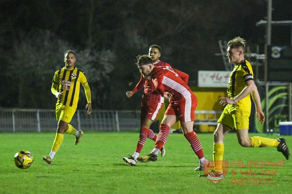 Felixstowe & Walton United moved back into fifth position with a 3-1 win at an in-form Basildon United on Tuesday. Leading from a Josh Hitter strike on 36 minutes, Felixstowe should have been further ahead before the home side took advantage of an error at the back on 74 minutes to equalise. The Seasiders showed great character to bounce back and dominate the remainder of the game and grabbed two goals in the process, Leon Ottley-Gooch heading firmly past the keeper on 81 minutes and Billy Holland nodding into an empty net after Zak Brown had struck the bar with his effort on 86 minutes. Basildon had a couple of chances in the first half from ricochets around the area and Josh Hitter, Noel Aitkens and Ollie Canfer came desperately close to second half goals as the three points were bagged. Canfer was taken to hospital after the match after suffering a nasty gash to his forehead towards the end of the match, he will be doubtful for Saturday’s trip to Bury Town and the second part of the Easter blockbuster weekend when Stowmarket visit on Monday.