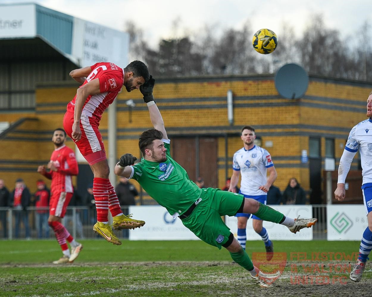 It was a surprise the game was on, although Felixstowe were more than keen to play today and avoid a midweek trip to Hertfordshire later in the season. Enfield groundshare at National League North side Bishop’s Stortford at their impressive stadium just at the end of the Stansted Airport runway, and the pitch would have been deemed unplayable on most other occasions. We assume the pitch has reached a point where it will not improve this season so both clubs have to now just get the games played. Huge areas of the pitch were a combination of mud and sand where the ball would not bounce and this was certainly going to make playing our usual brand of quick, passing football difficult.