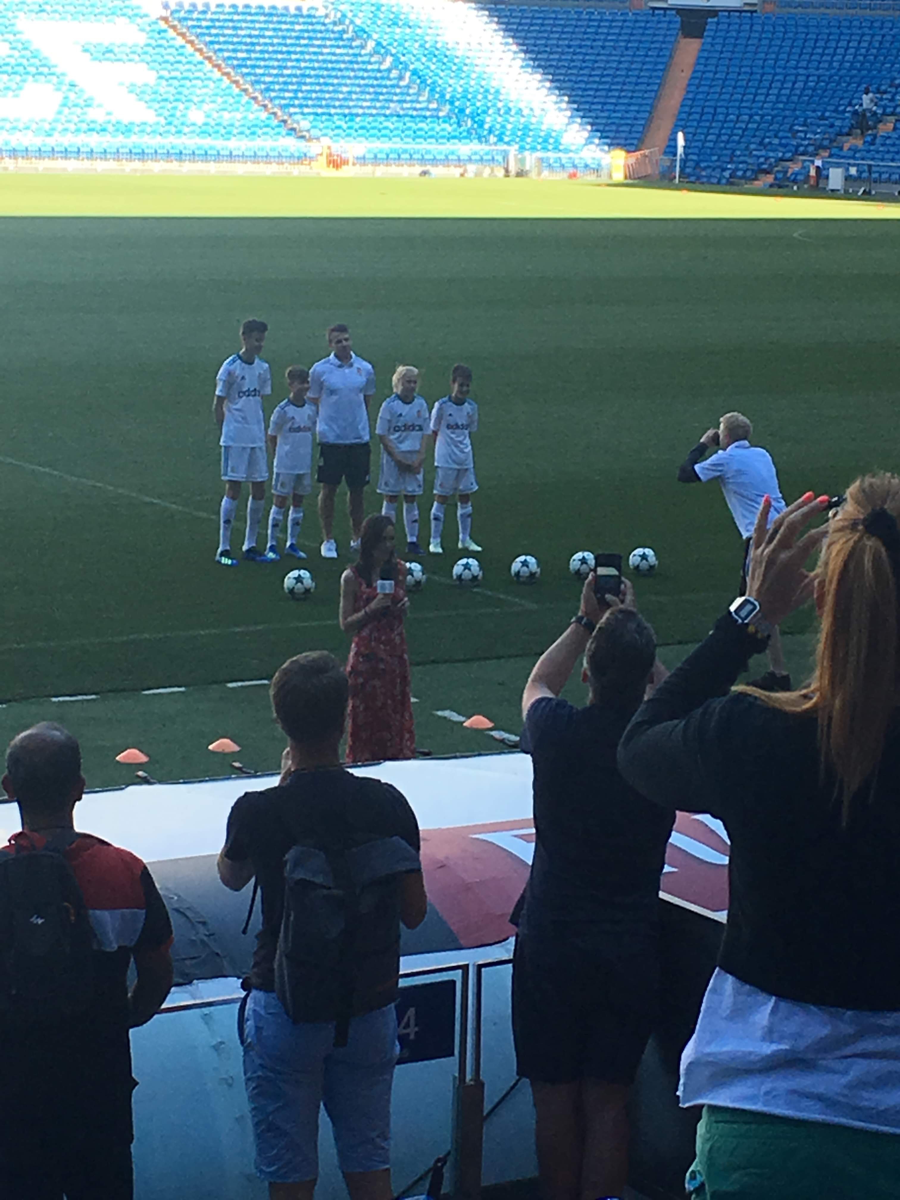 The following day it was onto the bus at 9am for the short trip to the Bernabeu Stadium. All the children entered the ground via the players’ entrance and all the parents were ushered to the stand via a side door.!!! The parents waited patiently in the stadium and then, to the sound of the Champions League music, thirty children dressed in their new Real Madrid kit and boots proudly marched out of the players’ tunnel and on to the pitch. A million photographs later and they started training and then played matches on the hallowed turf of the Bernabeu. After the matches finished it was more photographs before going back into the changing rooms to get back into their training gear.